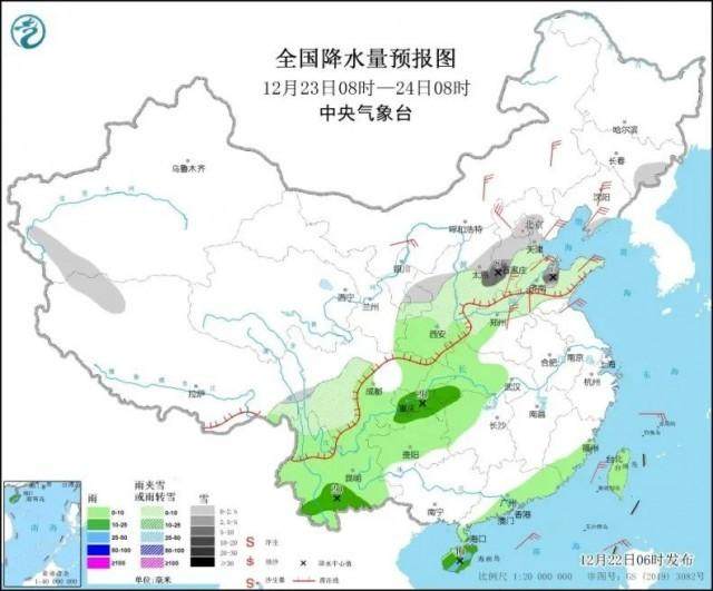 其中,华北、黄淮雨雪天气主要出现在23日,当天23时前后华北南部、黄淮北部雨转雨夹雪,山东半岛还会出现冷流降雪,局地雪势强劲;24日,山西、陕西以及山东等地会降纯雪。