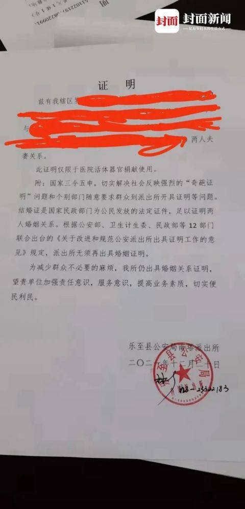 之所以有这样一份证明,原因是乐至县居民罗某的妻子身患尿毒症,在成都一家医院就医换肾,而罗某刚好匹配成功,但打算做活体器官捐献手术时,被医院要求证明两人存在婚姻关系。罗某带来了结婚证、户口簿,却不被医院认可,不得已到当地派出所开具证明。