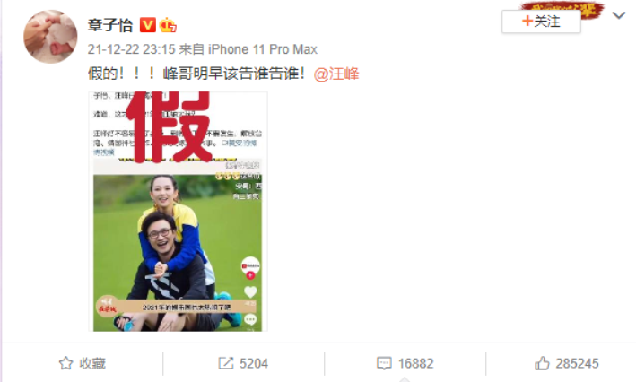 22日晚,章子怡发微博回应离婚传闻:假的!!!峰哥明早该告谁告谁!