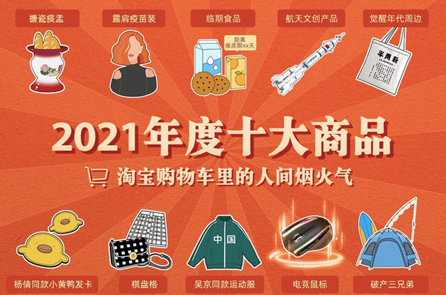 12月22日,淘宝发布“2021年度十大商品”,频上热搜的奥运冠军“杨倩同款小黄鸭发卡”、年初火到海外的“搪瓷痰盂”、热播剧《觉醒年代》周边、表情包里天天见的“吴京同款运动服”等网红商品高票入选。