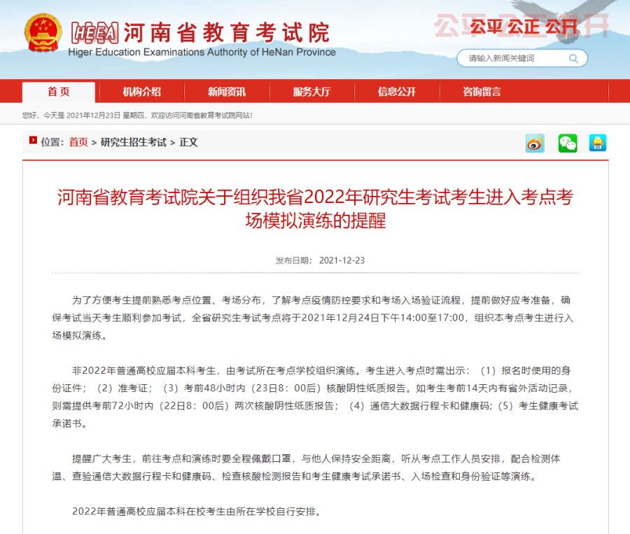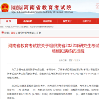 12月23日,记者从河南省教育考试院获悉,为了方便考生提前熟悉考点位置、考场分布,了解考点疫情防控要求和考场入场验证流程,提前做好应考准备,确保考试当天考生顺利参加考试,全省研究生考试考点将于2021年12月24日下午14:00至17:00,组织本考点考生进行入场模拟演练。