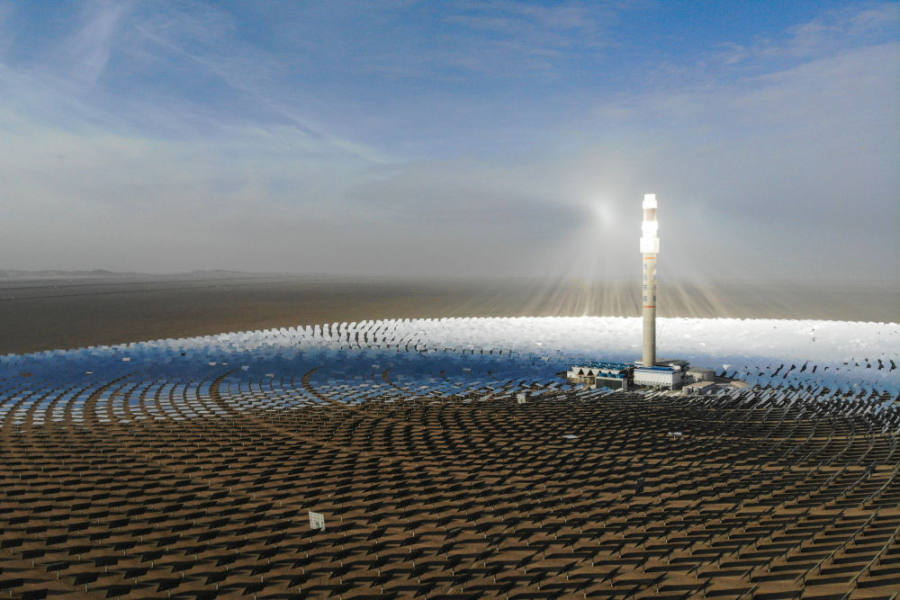 ↑2月24日拍摄的敦煌100兆瓦熔盐塔式光热电站(无人机照片)。在甘肃省敦煌市向西约20公里处,被称为“超级镜子发电站”的首航高科敦煌100兆瓦熔盐塔式光热电站在戈壁滩上闪耀。这是我国目前建成规模最大、吸热塔最高、可24小时连续发电的100兆瓦级熔盐塔式光热电站。