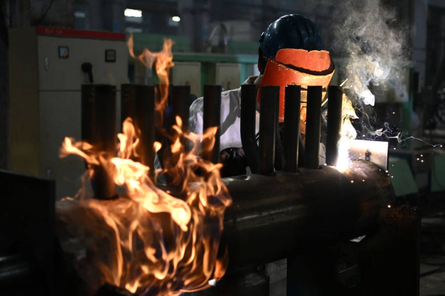 ↑哈电集团哈尔滨锅炉厂有限责任公司“80后”电焊工陈井坤在联箱分厂作业(4月14日摄)。2021年,哈电集团制定了应对碳达峰、碳中和的专项行动方案,改造提升传统动能,扩展绿色能源版图。