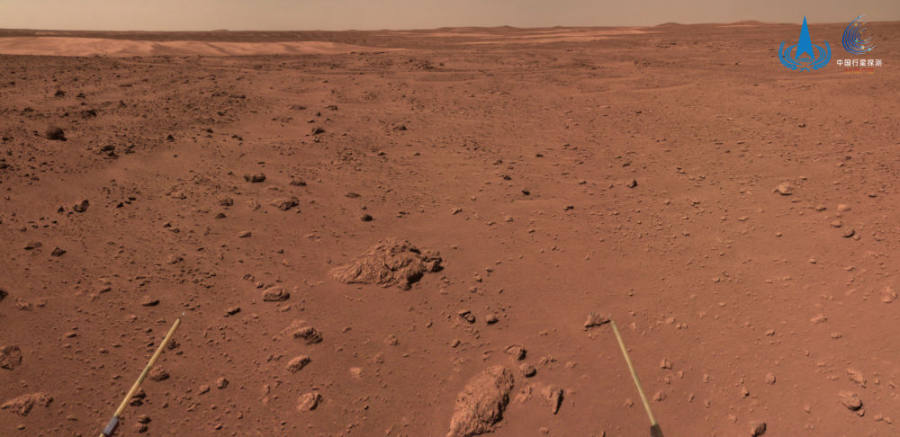 ↑这是“祝融号”火星车导航地形相机拍摄的图片。我国首次火星探测任务于2021年5月15日成功实现火星着陆。