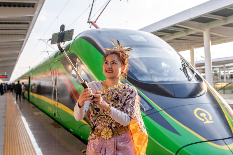 ↑12月3日,连接昆明和万象、采用中国标准的中老铁路全线开通运营。这是当日一名来自泰国的旅客在中国玉溪站自拍留念。