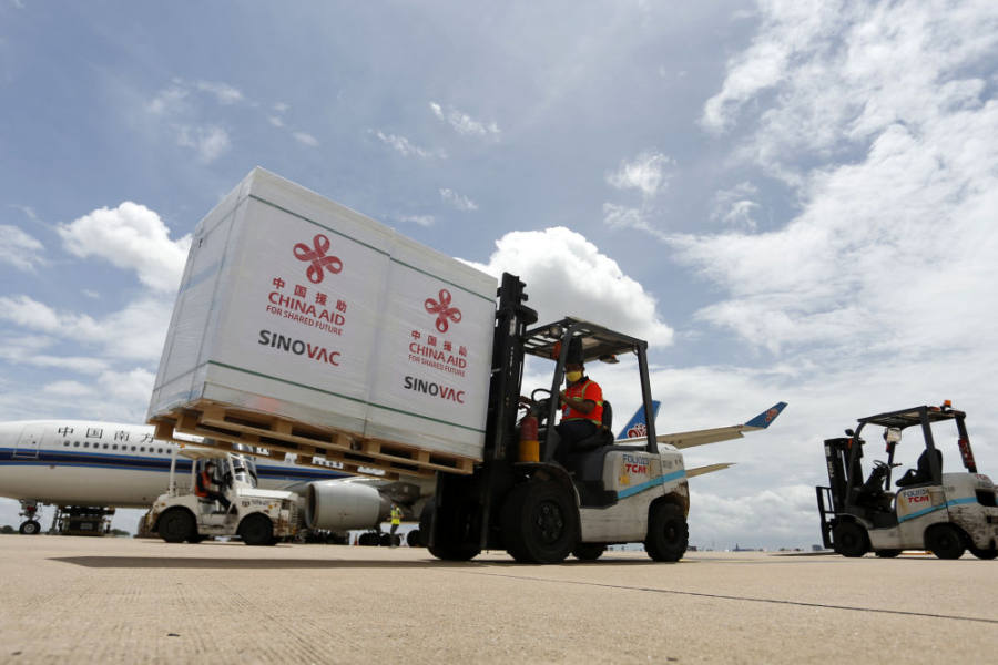 ↑10月14日,工作人员在柬埔寨金边国际机场运输中国政府援助柬埔寨的科兴新冠疫苗。