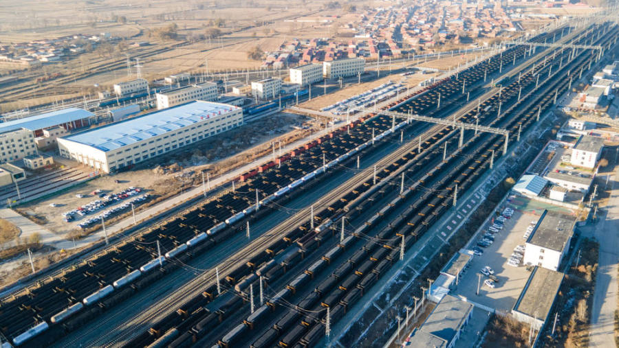 ↑11月23日,运煤列车在呼和浩特南站整装待发(无人机照片)。今冬明春向国内18个省区市提供用煤任务的内蒙古自治区,各煤矿生产现场热火朝天,公路、铁路运输繁忙。