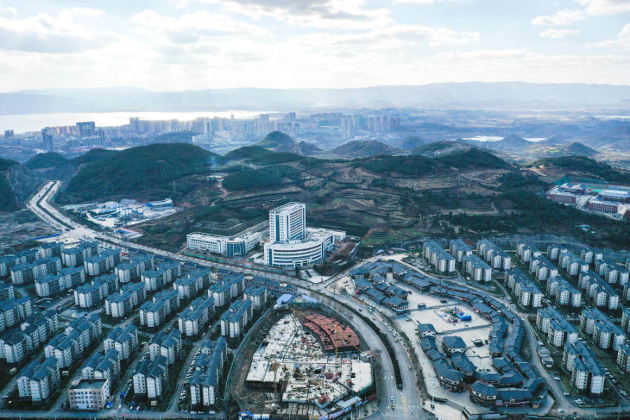 ↑这是贵州省威宁县五里岗街道朝阳新城和阳光新城易地扶贫搬迁安置小区(11月28日摄,无人机照片)。