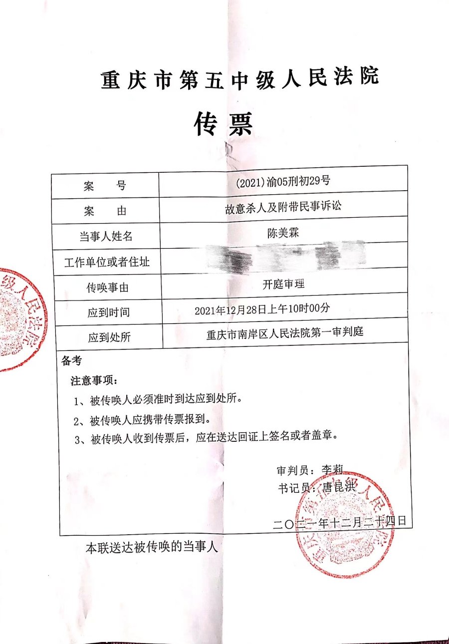 陈美霖收到的法院传票显示,张波叶诚尘故意杀人案一审将在下周二再次开庭。当事人供图