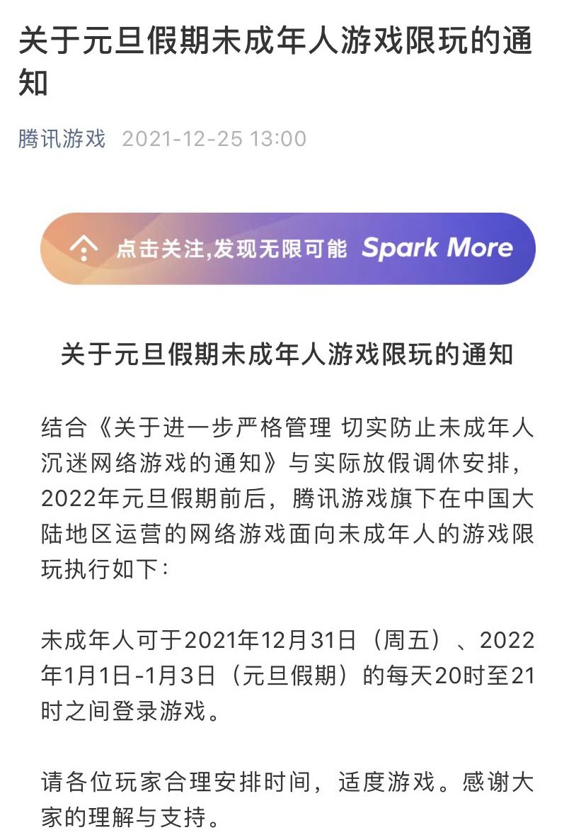 12月25日,腾讯游戏发布《关于元旦假期未成年人游戏限玩的通知》称👇
