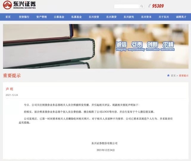 针对该事件,12月24日,东兴证券发布声明称:经核实,该合照系债券业务总部个别人员自费拍摄、擅自贴附了公司LOGO等内容,并自行发布于个人微信朋友圈。东兴证券表示,公司发现后,已第一时间要求相关人员删除收回相关照片。对于相关人员该种不当情形,公司已要求其规范个人行为,并采取责任追究措施。