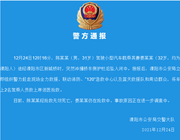 12月24日中午12时,一辆特斯拉轿车冲撞江苏常州溧阳市区新城桥护栏后坠河,车上乘坐的两人是夫妻,丈夫于24日抢救无效身亡,妻子则在抢救中。