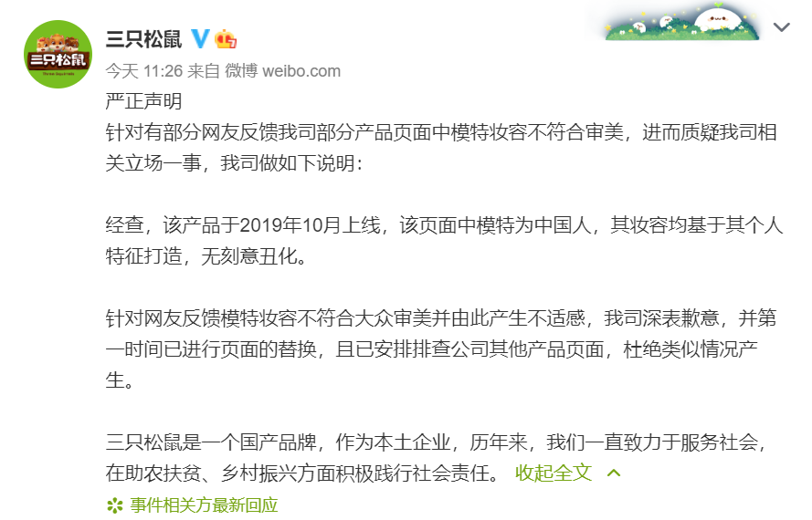 26日,针对部分网友质疑三只松鼠部分产品页面中模特妆容不符合审美一事,三只松鼠发布声明表示,经查,该产品于2019年10月上线,该页面中模特为中国人,其妆容均基于其个人特征打造,无刻意丑化。