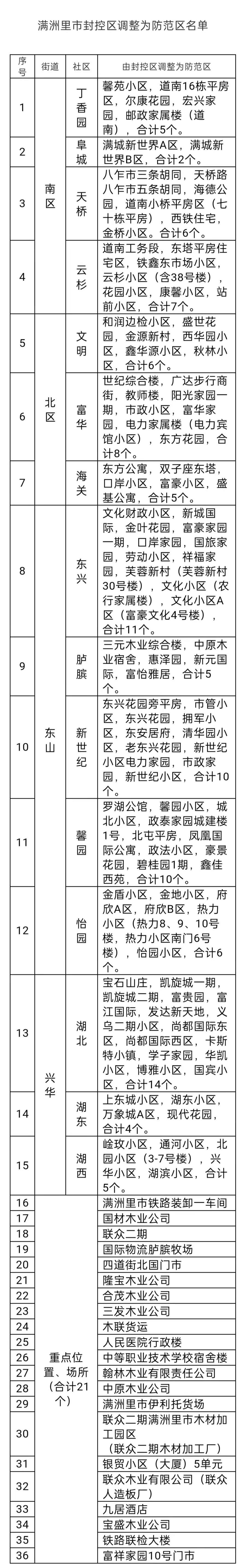 据满洲里市新冠肺炎疫情防控指挥部消息,根据内蒙古自治区新冠肺炎疫情防控指挥部满洲里市现场处置工作专班《关于印发满洲里市、扎赉诺尔区解除小区封控、管控工作方案的通知》精神,经满洲里市新冠肺炎疫情防控指挥部审核批准,府欣A区等125个小区、位置、场所符合解除封控标准,自发布时起,调整为防范区。按照“解封不解防”原则,落实市118号公告防范区管理措施,待防范区所在街道风险等级调为低风险后,落实常态化疫情防控措施,有序恢复正常生产生活秩序。