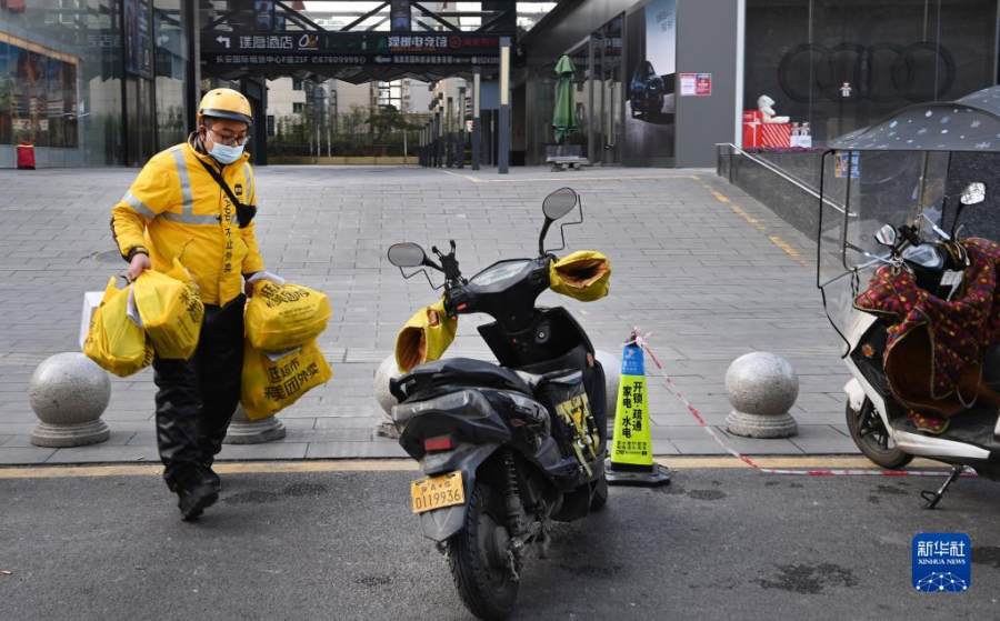 12月26日,外卖员在西安市南门外路边忙碌。新华社记者 陶明 摄