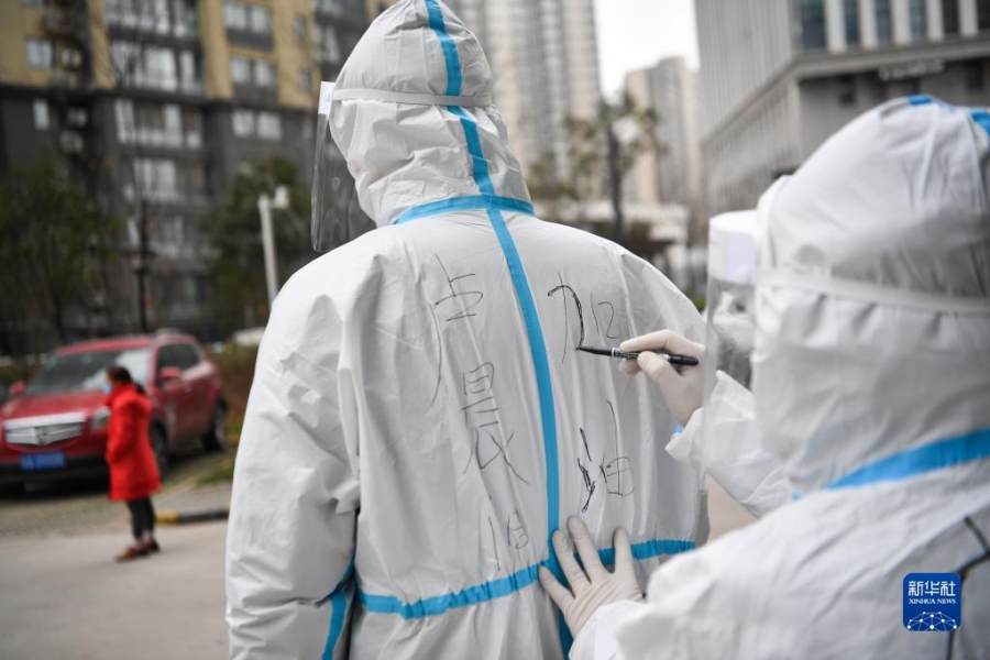 12月27日,在西安市雁塔区孟村小区,社区工作人员在卢晨阳的防护服写加油标语。新华社记者 张博文 摄