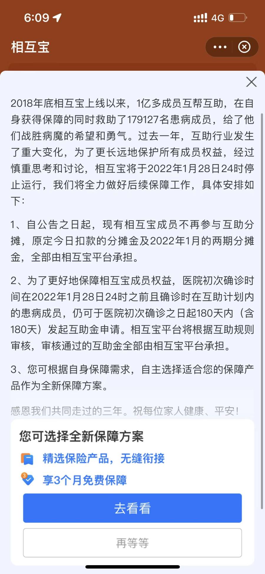 相互宝12月28日公告,互助计划将于2022年1月28日停止运行。自公告之日起,成员不再参与互助分摊。关停前确诊的患病成员,依旧可发起互助申请,互助金将由相互宝平台承担。