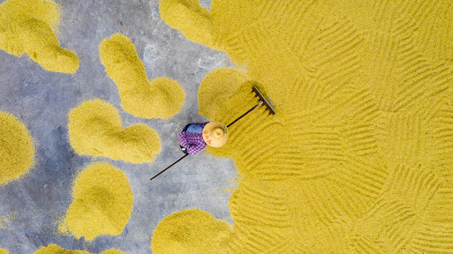江西省九江市湖口县均桥镇新庄村三组村民正在晾晒刚刚收割的晚稻。 (IC photo/图)
