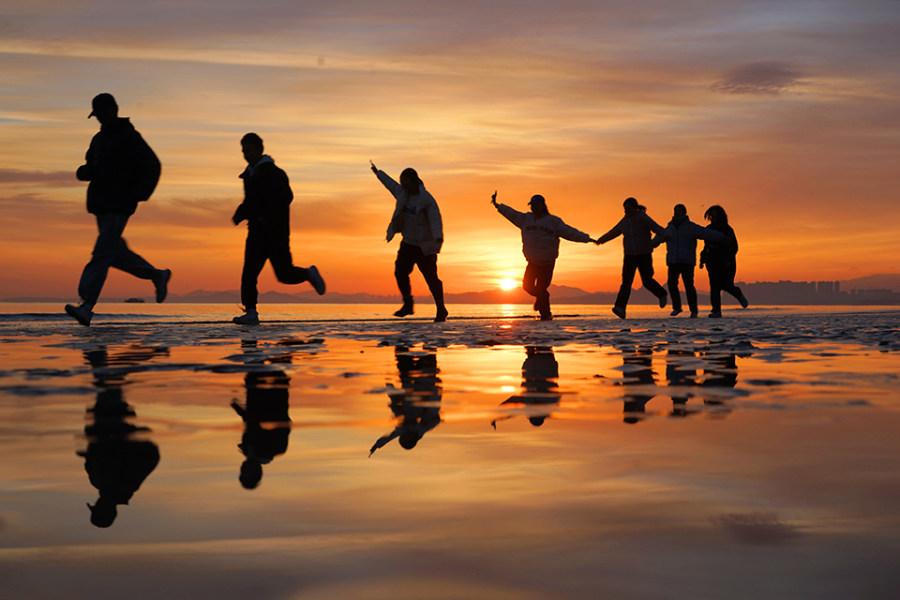 2021年11月28日,山东省烟台市一处海滨沙滩,一队晨练的大学生正在跑步。 (视觉中国/图)
