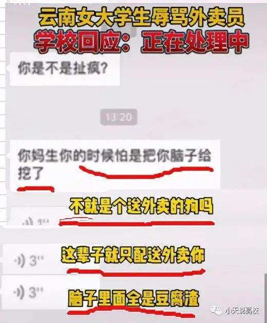 12月26日,云南体育运动职业技术学院一女生辱骂外卖员小虎“就是送外卖的狗,死在你爹怀里”等,小虎听到后心情变得很糟,然后选择了取消订单,将餐食送回商家,找客服申诉。目前,学校已和相关部门成立调查组。(12月29日人民资讯)