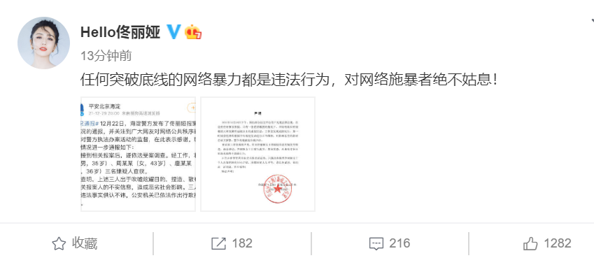 佟丽娅工作室发文:对网络施暴者绝不姑息