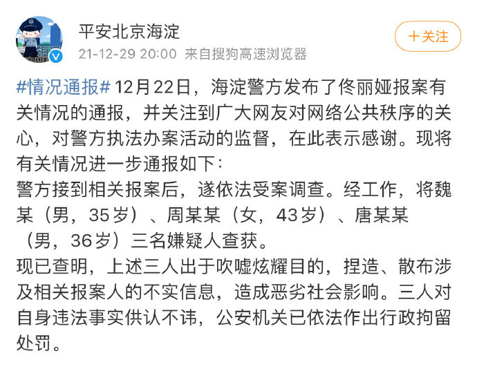 稍早前,海淀警方发布了佟丽娅报案有关情况的进展通报: