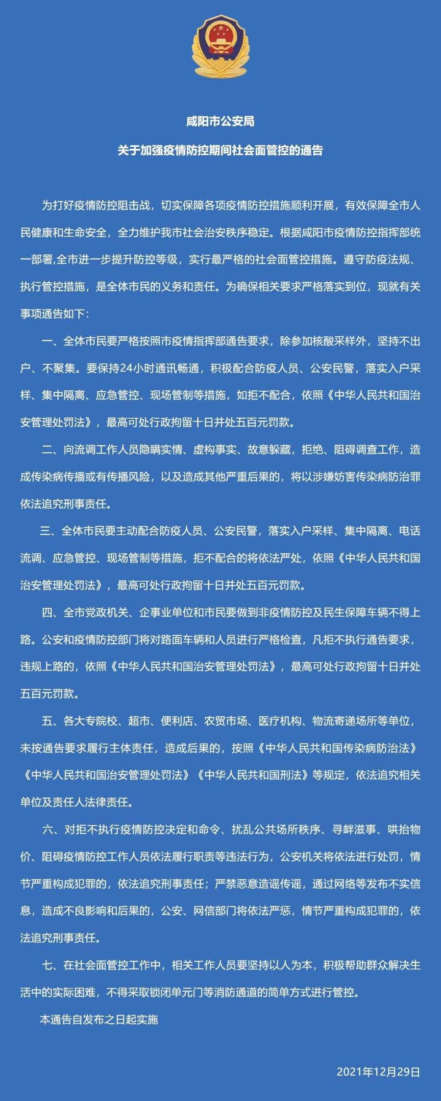 12月29日,陕西咸阳市公安局发布《关于加强疫情防控期间社会面管控的通告》,通告疫情防控相关事项如下:
