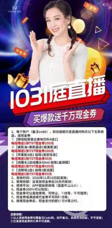 赵华告诉记者,随着最近几年网络直播的兴起,“TST庭秘密”内部经营模式也发生了变化,总公司大力倡导全员进军网络直播。张庭会让自己下面的各级代理商去她直播间购买产品刷业绩,之后再给代理商们返还抵用券,用于在“TST庭秘密”App上购买产品,“(她想)做抖音一姐,(让我们)去抖音下单,我们不愿意去,就返给我们抵用券,可以去App下单,可以抵钱。”