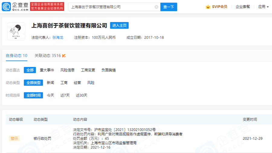 企查查APP显示,近日,喜茶关联公司上海喜创于茶餐饮管理有限公司新增行政处罚。