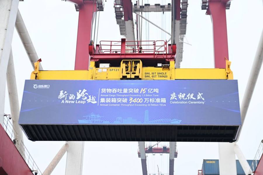↑在山东港口青岛港前湾集装箱码头,山东港口集团2021年第3400万标箱在吊装上船(12月23日摄)