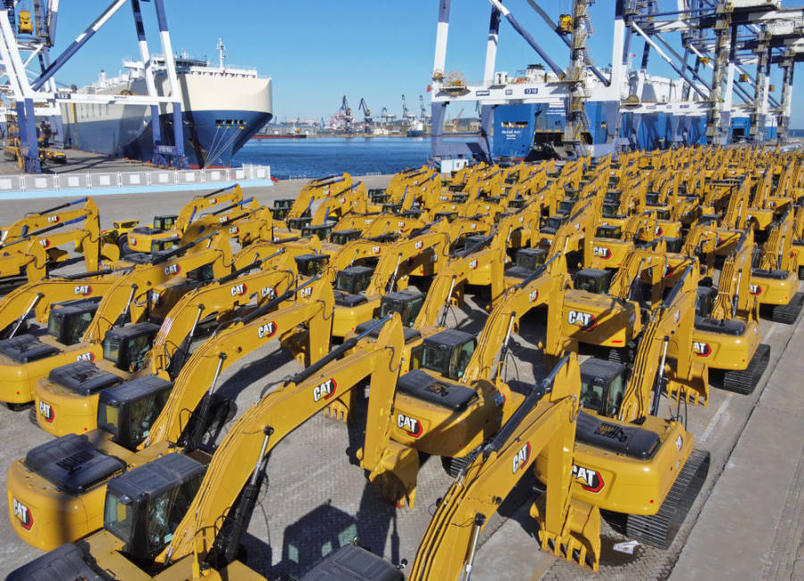 ↑出口工程机械在山东港口烟台港集结等待装船(12月7日摄,无人机照片)