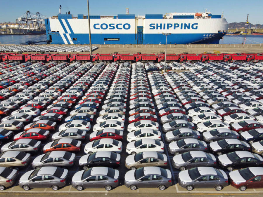↑大批出口商品车在山东港口烟台港集结等待装船(12月7日摄,无人机照片)