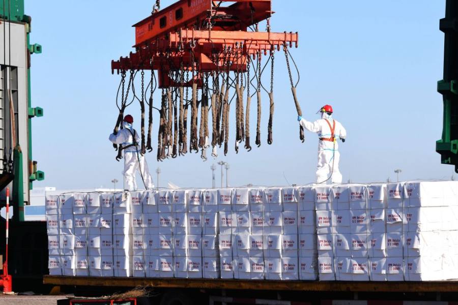↑在山东港口青岛港西联码头,码头工人在吊装进口纸浆(12月7日摄)
