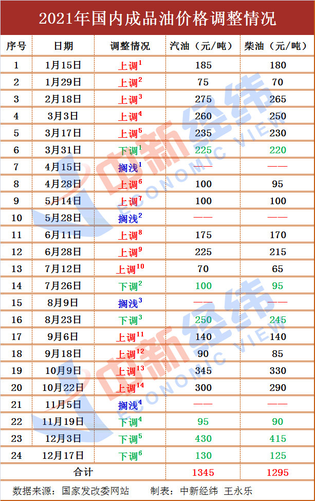 据统计,今年以来,国内成品油价格已进行24轮调整,累计“十四涨六跌四搁浅”,汽油价格整体上调1345元/吨,柴油价格整体上调1295元/吨。若本次调整落地,全年成品油调价将呈“十五涨六跌四搁浅”的格局。
