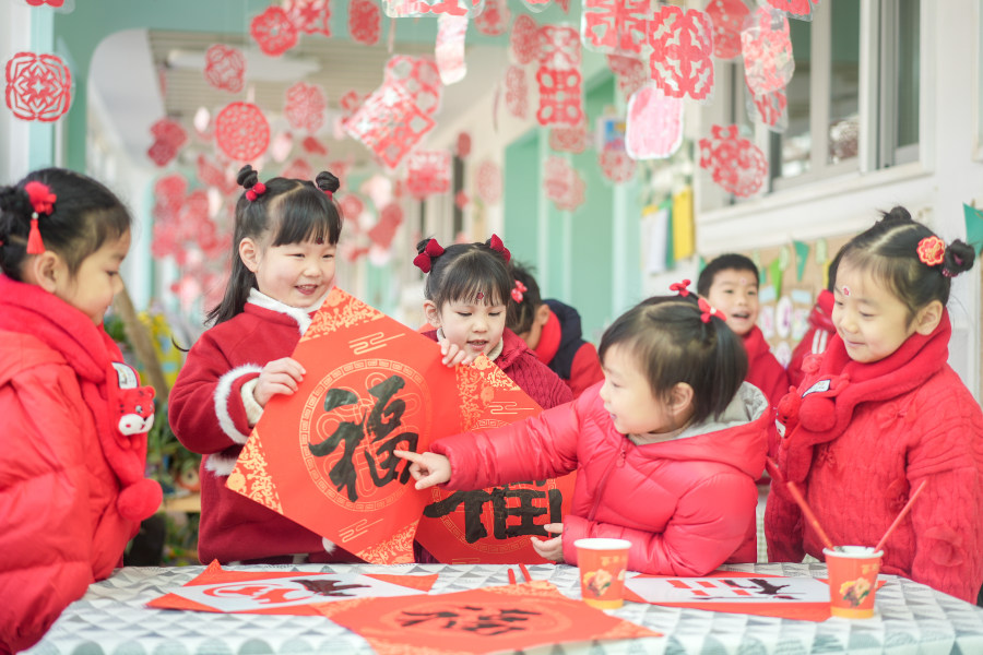 12月31日,浙江省湖州市长兴县龙山街道中心幼儿园的孩子们在展示“福”字。