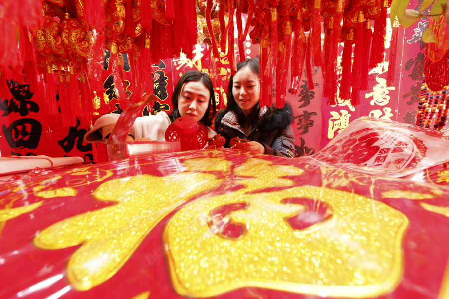 12月31日,在江苏省泗洪县一家店铺里,两名女子选购年货。