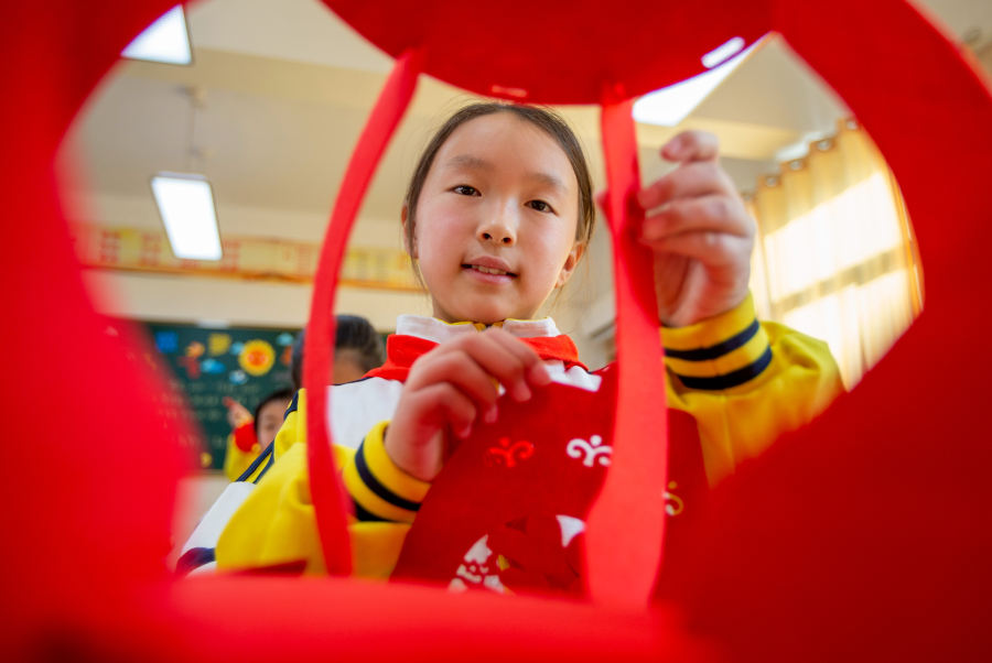 12月31日,江苏省海安市教师发展中心附属小学海光校区的孩子们在制作花灯。