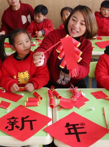 12月31日,山东省临沂市郯城县郯城街道官塘幼儿园的老师带领孩子们制作手工作品迎接新年。