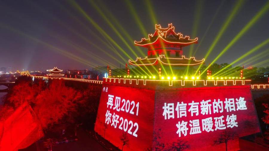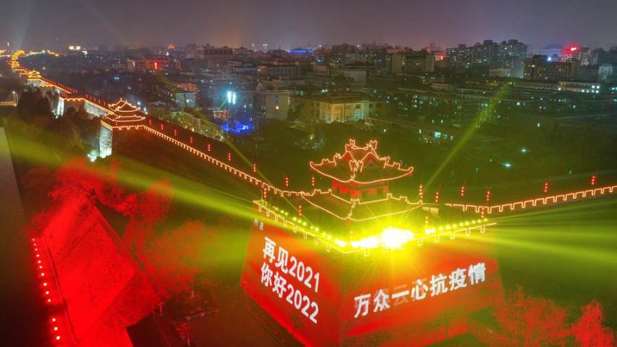 当晚,西安城墙景区在城墙东南角打出“再见2021 你好2022”“万众一心抗疫情”等光影字样,迎接新年到来的同时,向各行各业奋战在战疫一线的人们致敬。