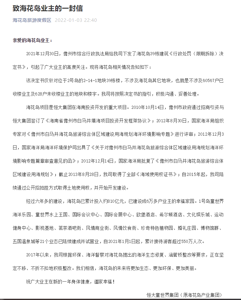 1月3日晚间,恒大童世界集团发布了致海花岛业主的一封信称,12月30日海南省儋州市综合行政执法局发布的行政处罚决定书,仅针对位于2号岛的2-14-1地块39栋楼,不涉及海花岛其它地块,也就是不涉及60567户已收楼业主及628户未收楼业主的地块和楼宇,“我司将按照决定书的指引,积极沟通、妥善处理。”