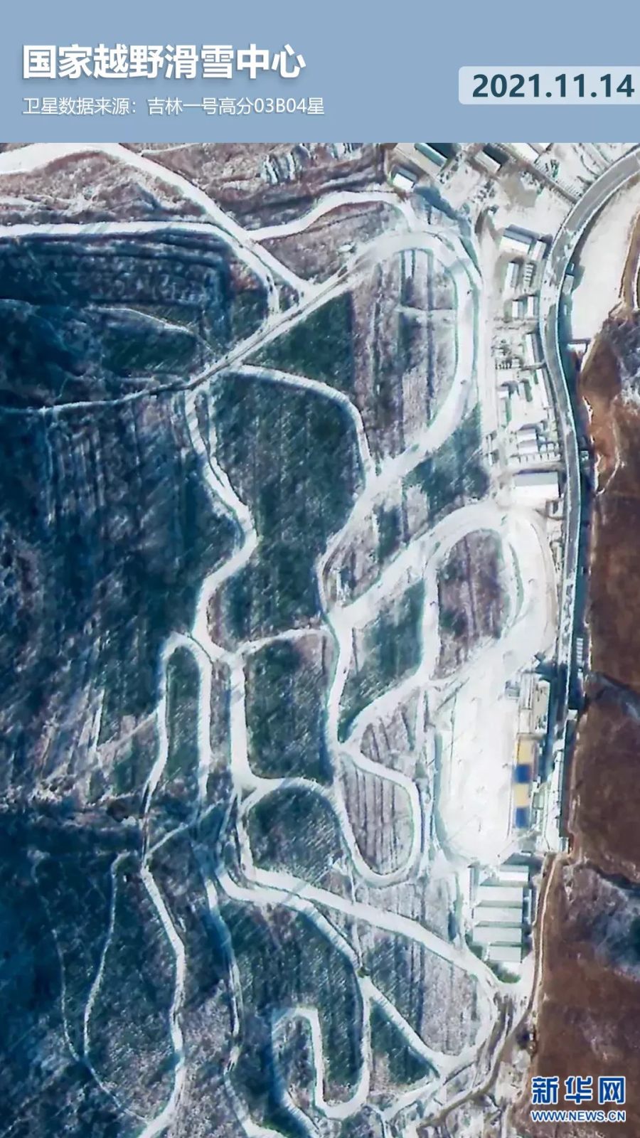 2021年11月15日,造雪机在张家口赛区国家越野滑雪中心进行造雪作业(无人机照片)。新华社发(武殿森摄)