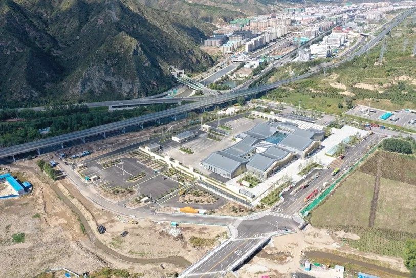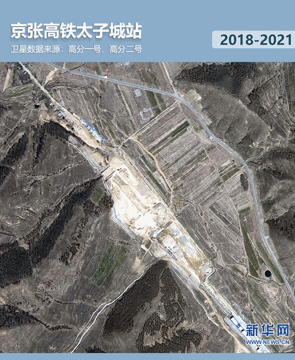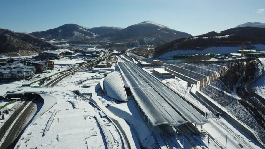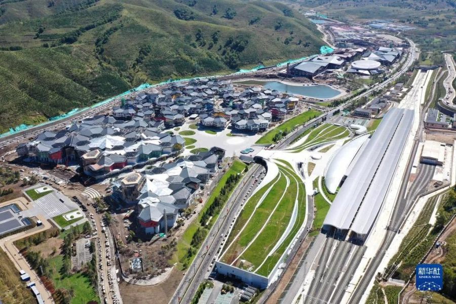 位于太子城冰雪小镇的冬奥颁奖广场(左)、太子城高铁站客运枢纽和太子城高铁站(2021年9月10日摄,无人机照片)。新华社发(武殿森 摄)