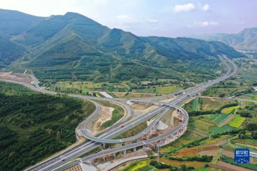 这是2021年8月31日拍摄的延崇高速河北段延伸工程张家口市崇礼白旗互通枢纽(无人机照片)。新华社发(武殿森 摄)