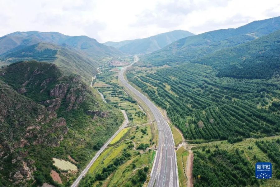 这是2021年8月31日拍摄的延崇高速河北段延伸工程部分路段(无人机照片)。新华社发(武殿森 摄)