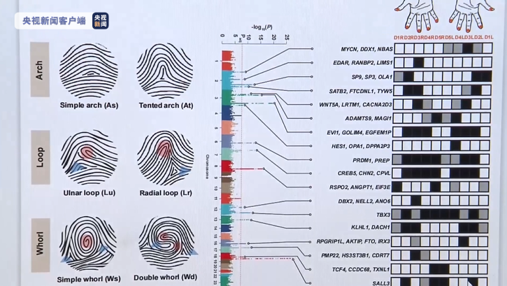中科院上海营养与健康研究所研究员 汪思佳:比如说手指的长度,我们发现斗型花纹越多的人,他的小指就越长,这个就非常有意思。这项研究最有突破性的就是,以前从来没有发现过指纹花纹差异背后到底是什么基因造成的,我们是第一次发现指纹的差异背后是肢体发育相关基因造成的。