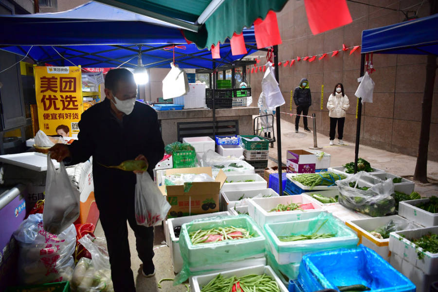 1月7日,居民在陕西西安曲江新区一小区便利店外选购菜品。新华社记者邵瑞 摄