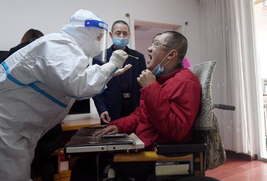 1月8日11时30分,家住郑州市二七区人和路街道办事处金牛水岸国际花园10号楼的张鹏,在家中迎来了穿红马甲的“志愿者”和穿防护服的“白衣天使”,他们专门上门为行动不便、需坐轮椅的张鹏进行核酸检测。这也标志着郑州市“敲门行动+上门服务”助力核酸检测应检尽检活动全面展开。