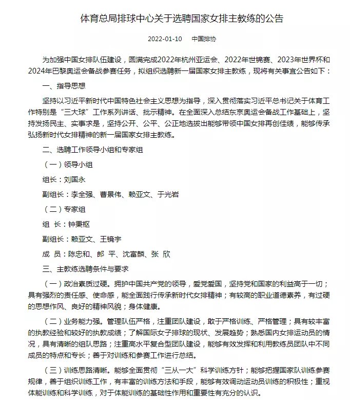 为加强中国女排队伍建设,圆满完成2022年杭州亚运会、2022年世锦赛、2023年世界杯和2024年巴黎奥运会备战参赛任务,拟组织选聘新一届国家女排主教练,现将有关事宜公告如下: