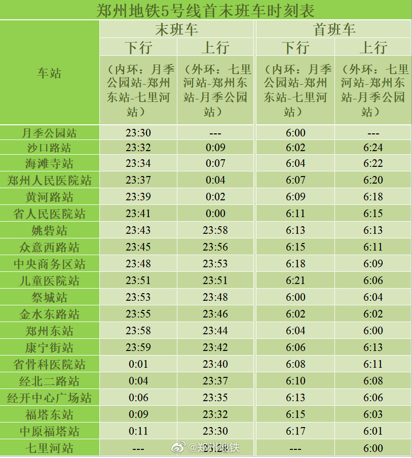 此外,地铁5号线运营交路调整为月季公园站~郑州东站~七里河站双向运行,其中工作日高峰期,月季公园站的行车间隔为15分钟,其余5号线车站为5~6分钟。首末班车时间根据运营范围有所调整。