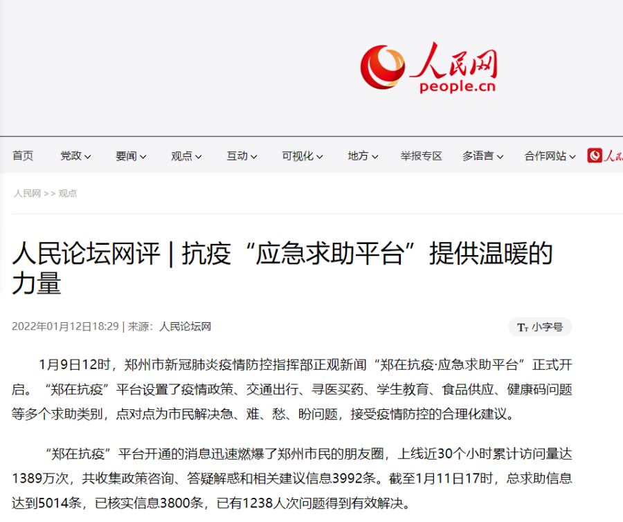 “郑在抗疫”平台开通的消息迅速燃爆了郑州市民的朋友圈,上线近30个小时累计访问量达1389万次,共收集政策咨询、答疑解惑和相关建议信息3992条。截至1月11日17时,总求助信息达到5014条,已核实信息3800条,已有1238人次问题得到有效解决。